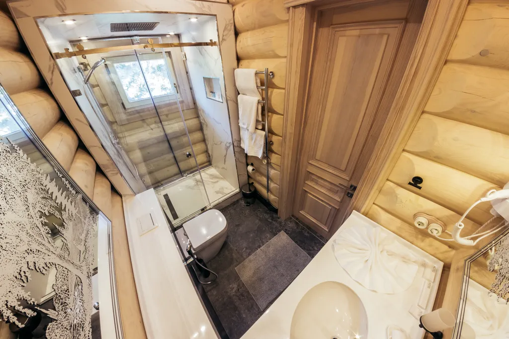 Душевая комплектуется индивидуальным комплектом банных полотенец, халатов, удобных тапочек, феном, и расширенным набором косметических средств.